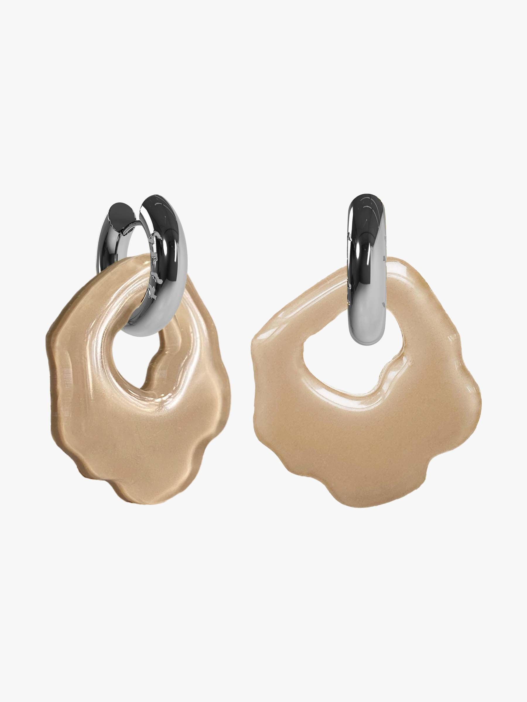 Abe, our first-ever Amoeba, is now available in an enticing new shade – a nude soft beige. This design showcases a light-catching, bead-like appearance on account of the 'glass' surface. It is accompanied by a 20-millimeter-thick gold stainless steel round hoop, ensuring both durability and a lightweight, comfortable feel.