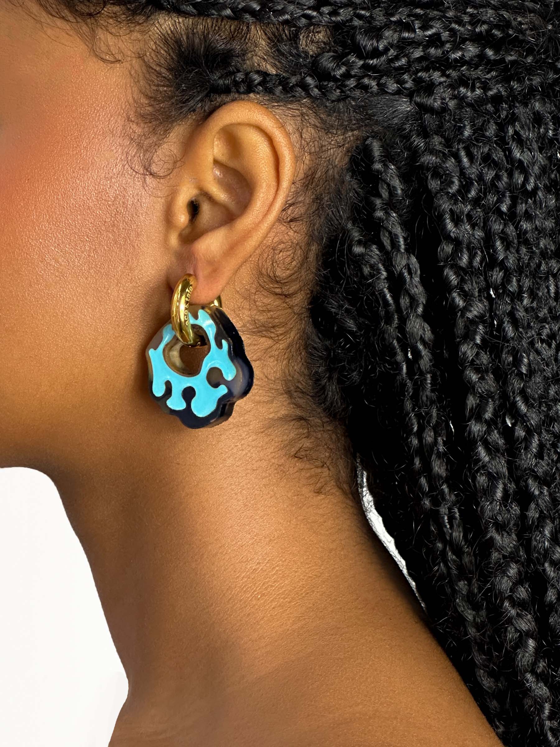 Abe-shaped earrings carved out of acetate. Filled with carnival blue resin paired with polished, gold stainless steel hoops. Engraved with both the Felt warped and Ace & Tate logos.