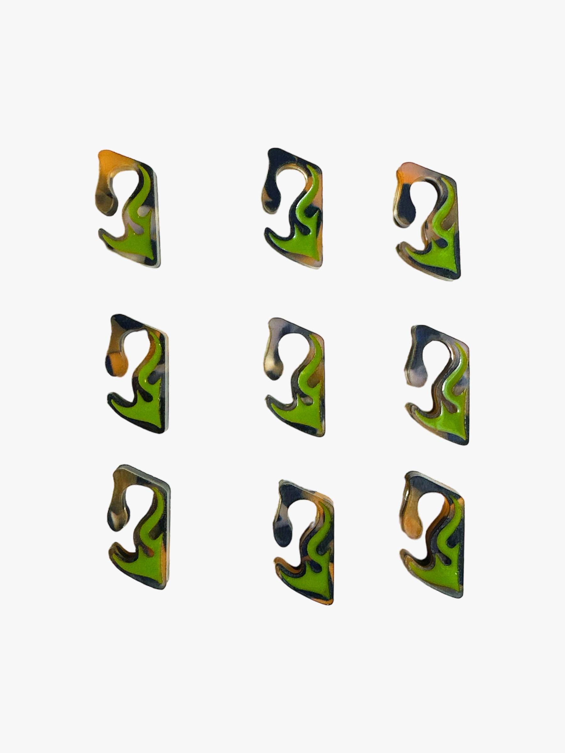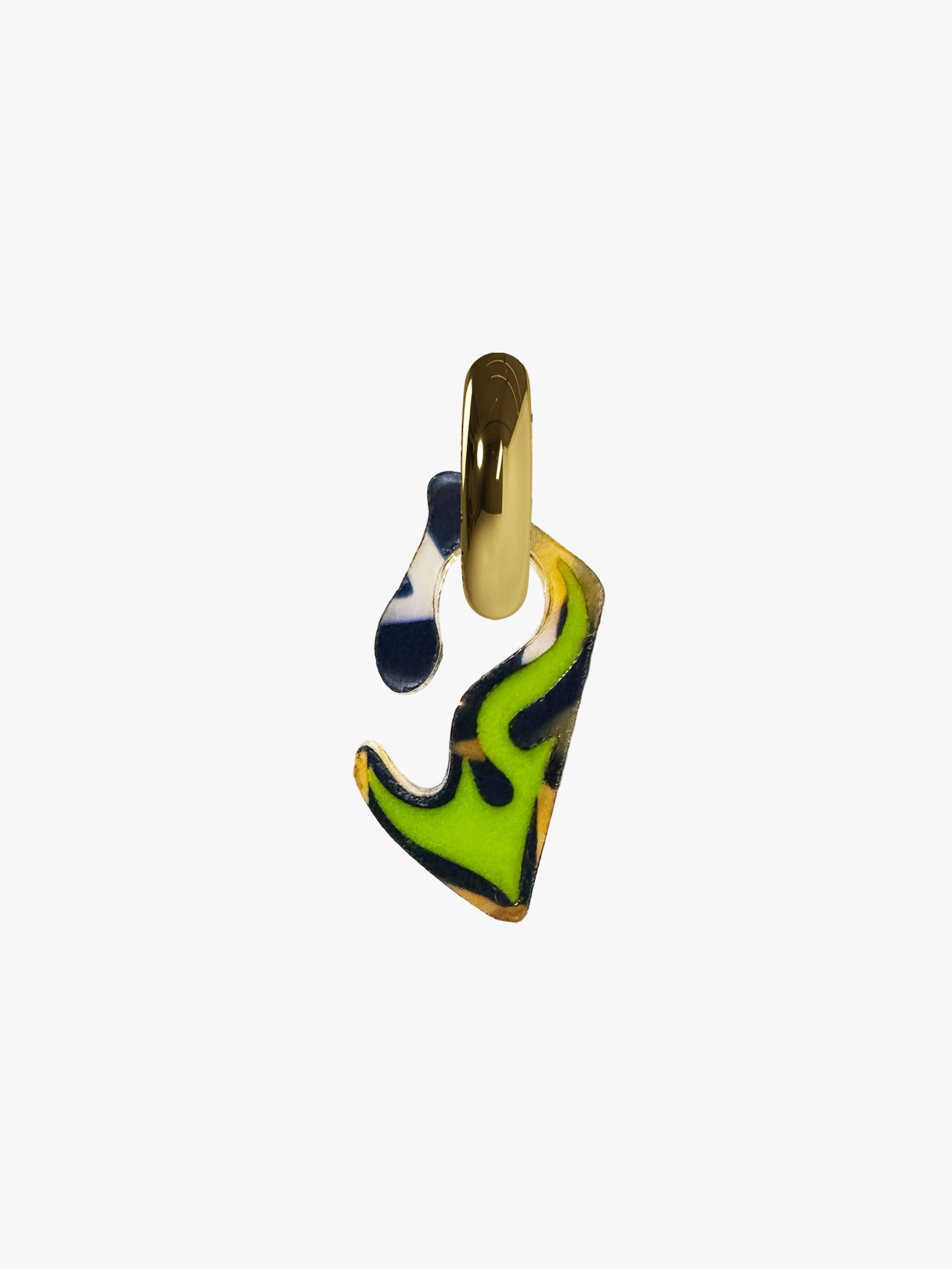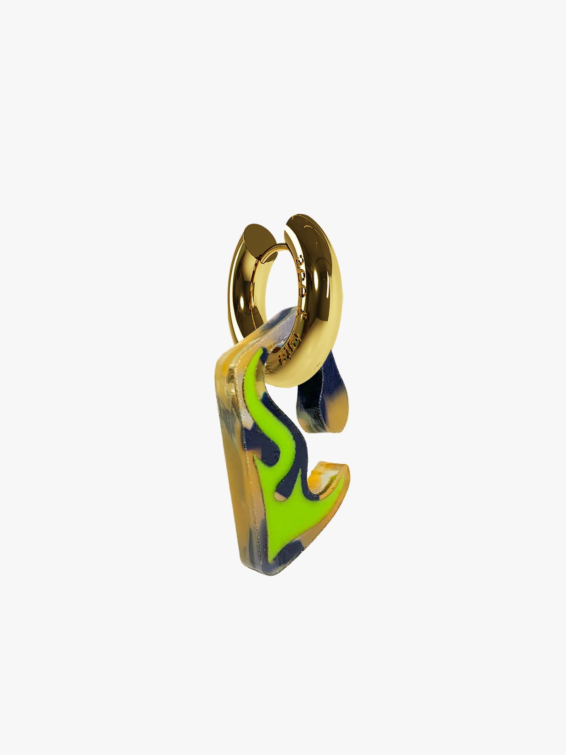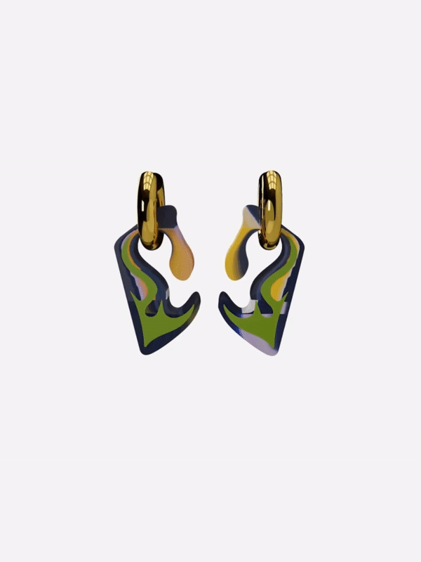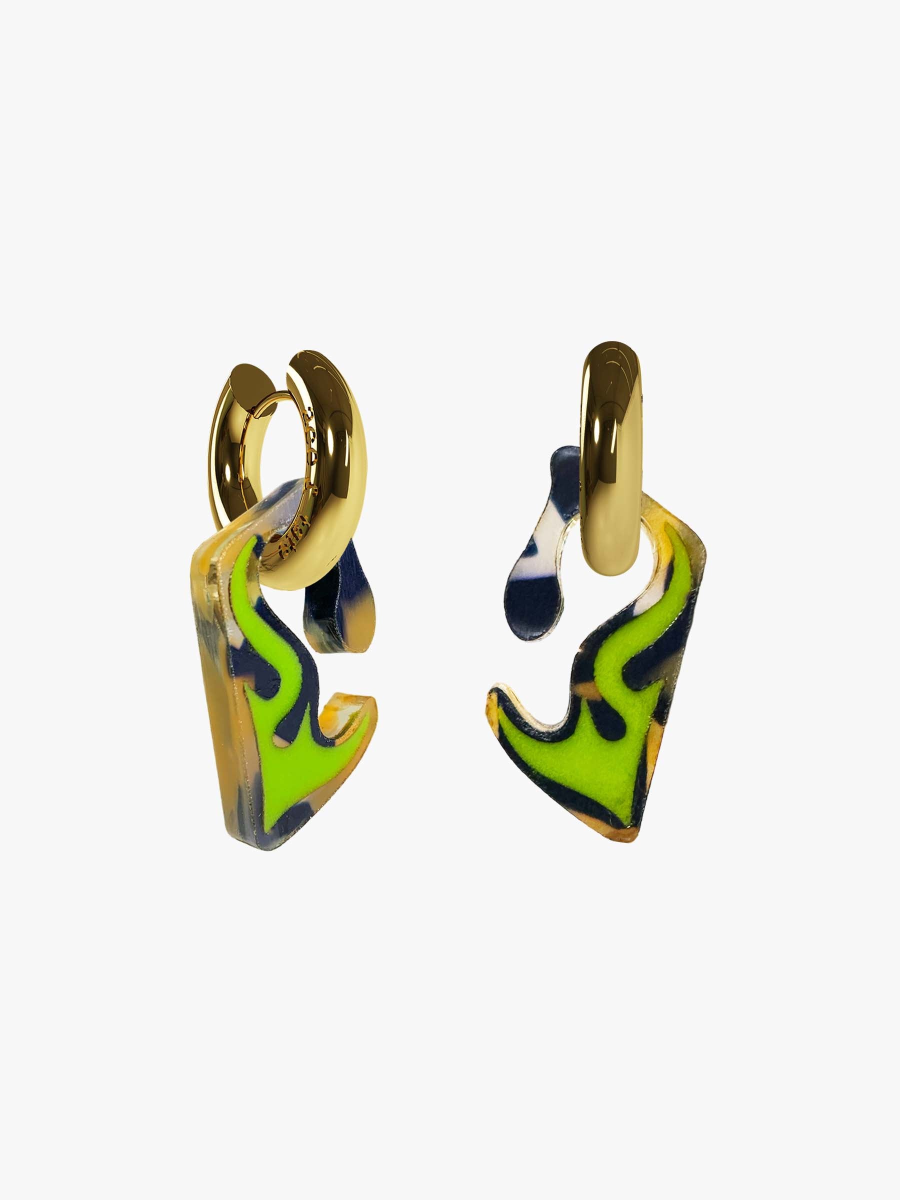Flamed-shaped earrings carved out of Carnival acetate. Filled with green resin paired with polished, gold stainless steel hoops. Engraved with both the Felt warped and Ace & Tate logos.