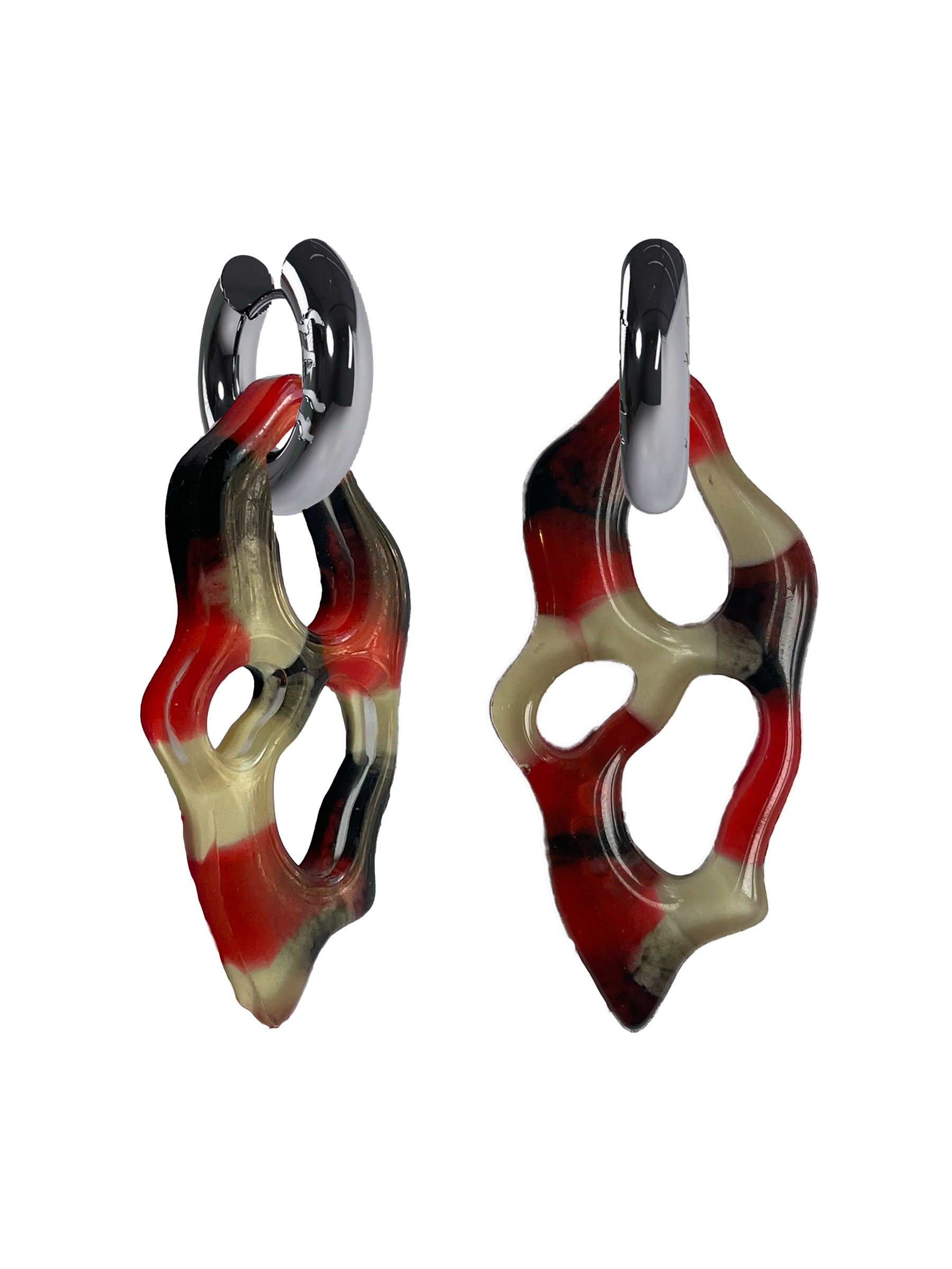 Amoeba-shaped resin earrings with stainless steel gold hoops. Handmade in Amsterdam. Hoops: 20 mm, Weight: 9 g.