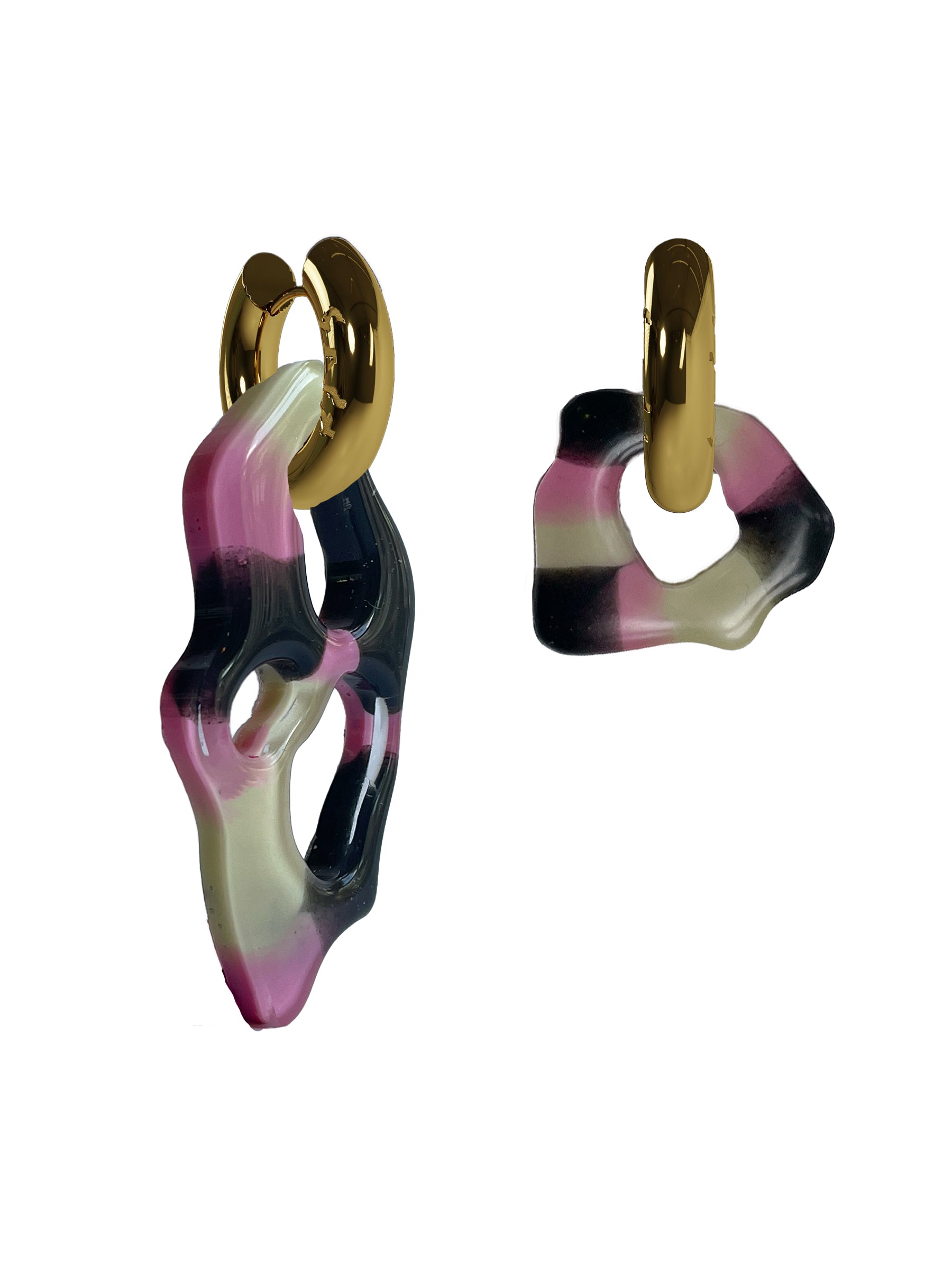 Amoeba-shaped resin earrings with stainless steel gold hoops. Handmade in Amsterdam. Hoops: 20 mm, Weight: 9 g.