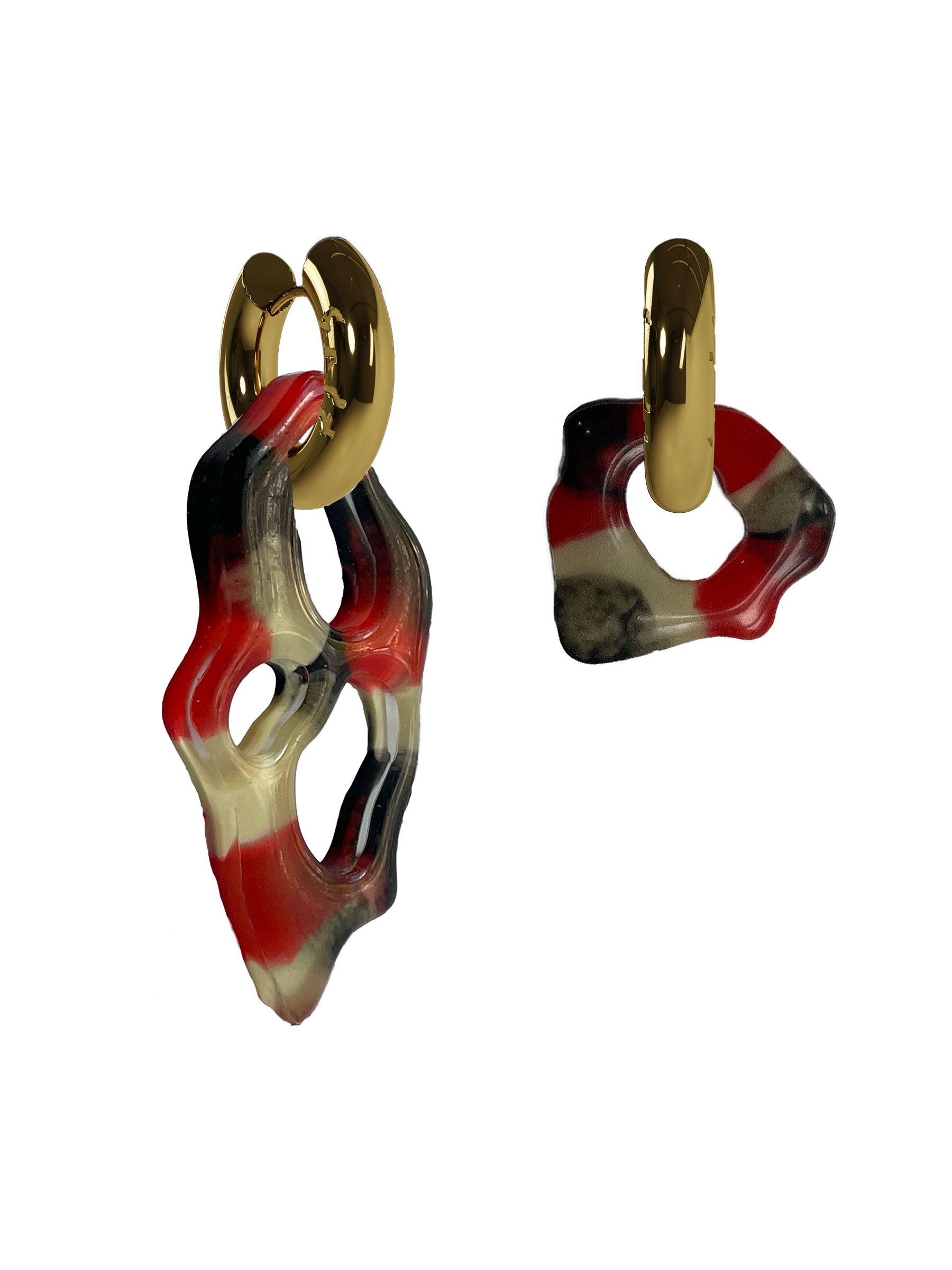 Amoeba-shaped resin earrings with stainless steel gold hoops. Handmade in Amsterdam. Hoops: 20 mm, Weight: 9 g.