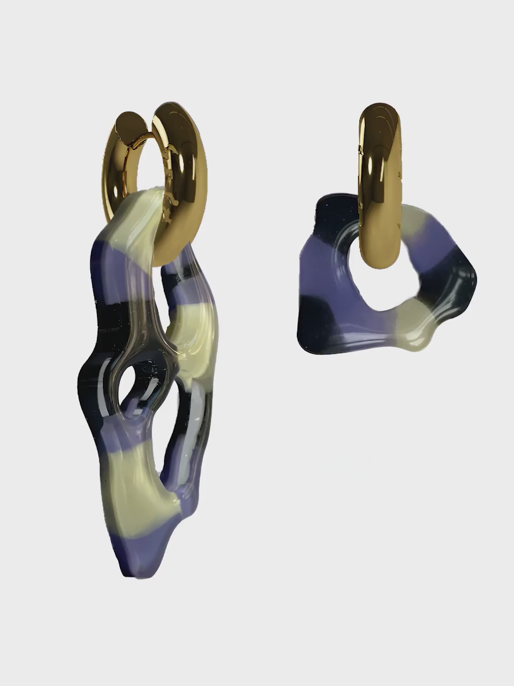 Amoeba-shaped resin earrings with stainless steel gold hoops. Handmade in Amsterdam. Hoops: 20 mm, Weight: 9 g.