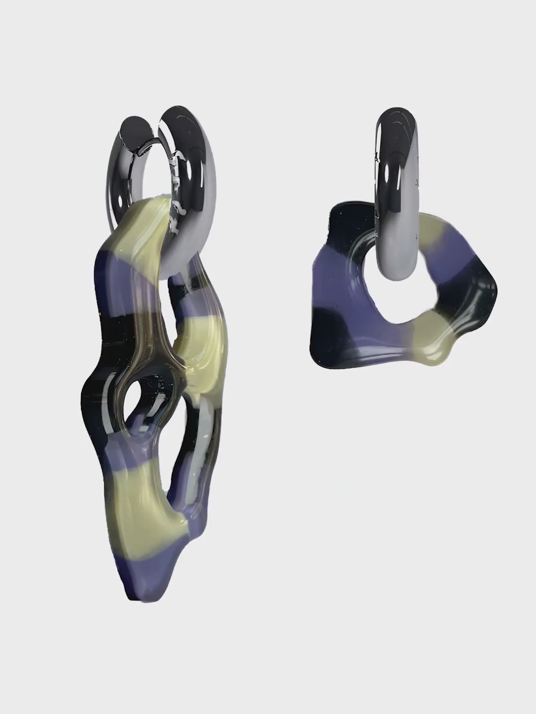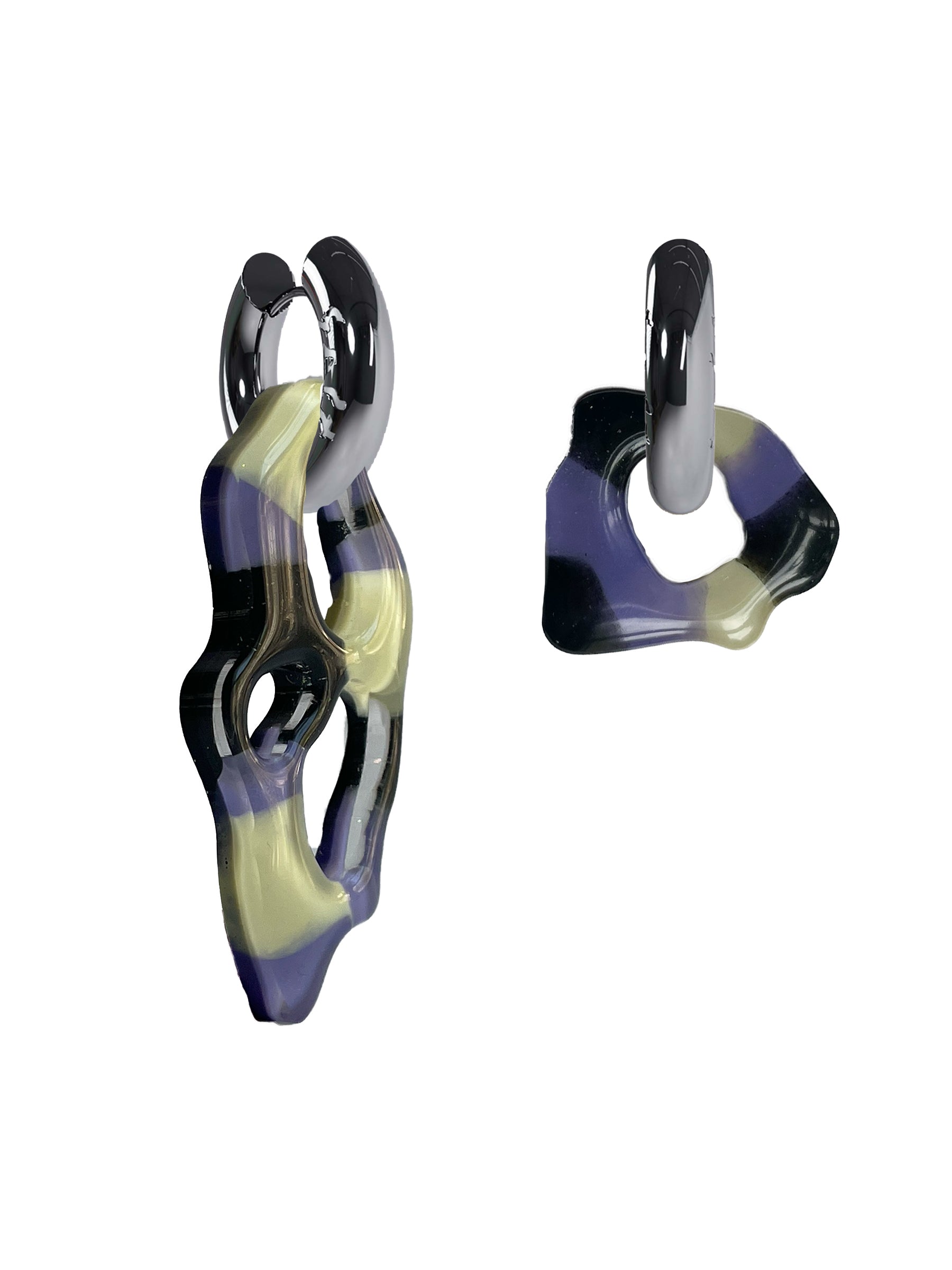 Amoeba-shaped resin earrings with stainless steel gold hoops. Handmade in Amsterdam. Hoops: 20 mm, Weight: 9 g.