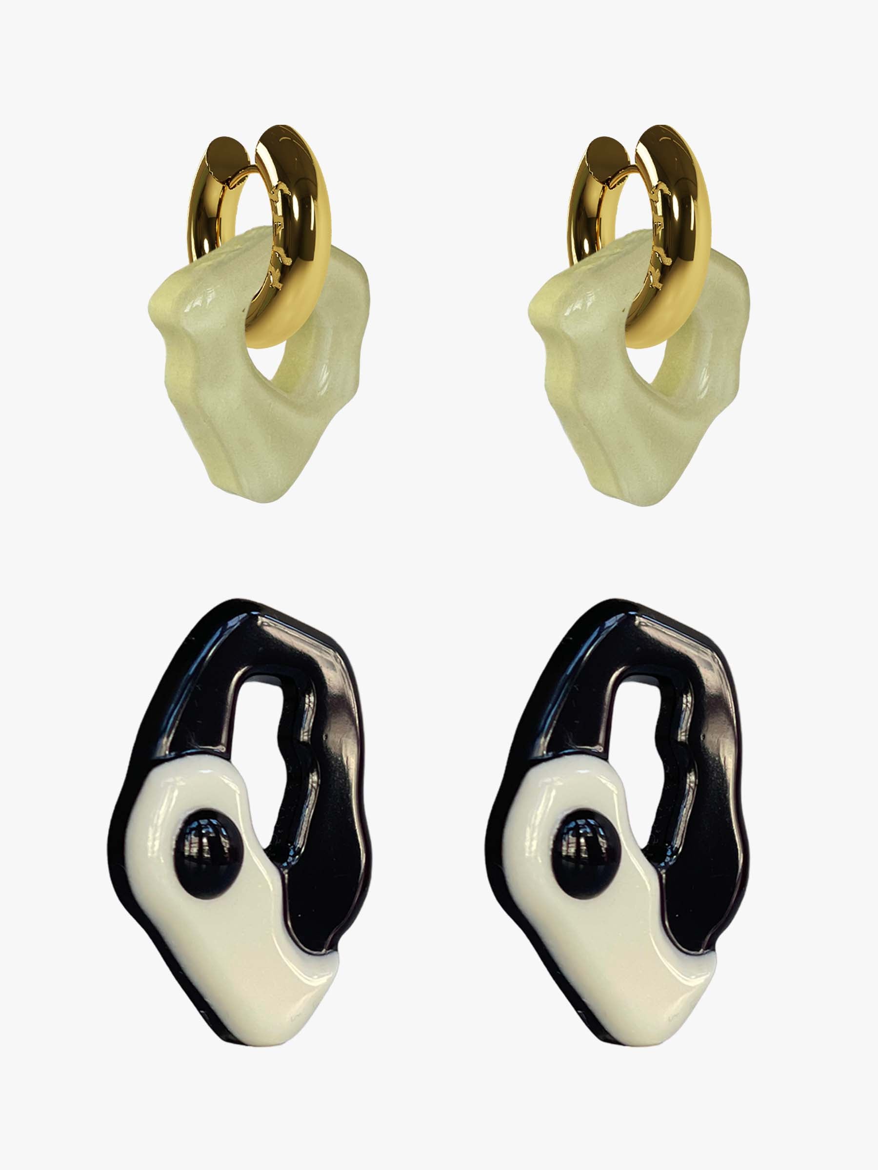 Contains Yin Yang black white Amoeba, Ora Amoeba in sage and two stainless steel gold 22 mm round hoops.