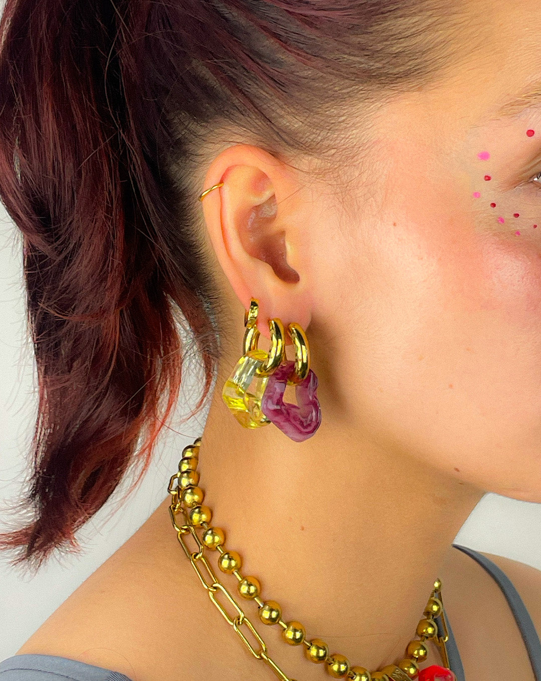 Amoeba-shaped resin earrings with stainless steel gold hoops. Handmade in Amsterdam. Hoops: 20 mm, Weight: 9 g.
