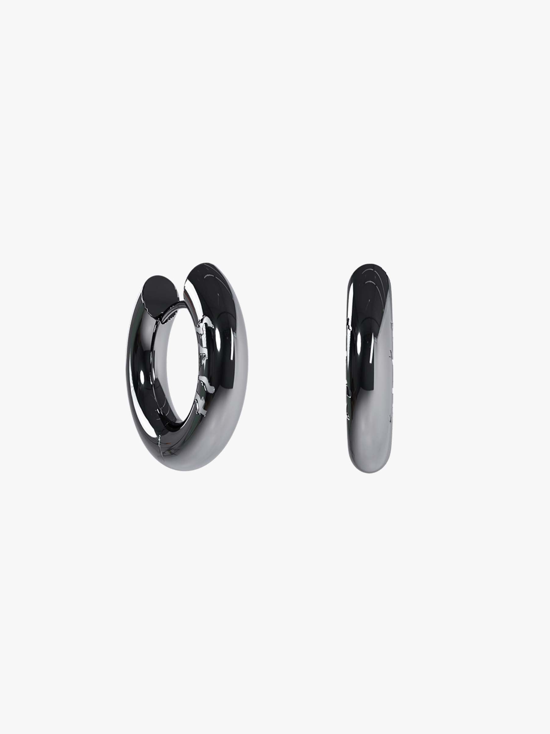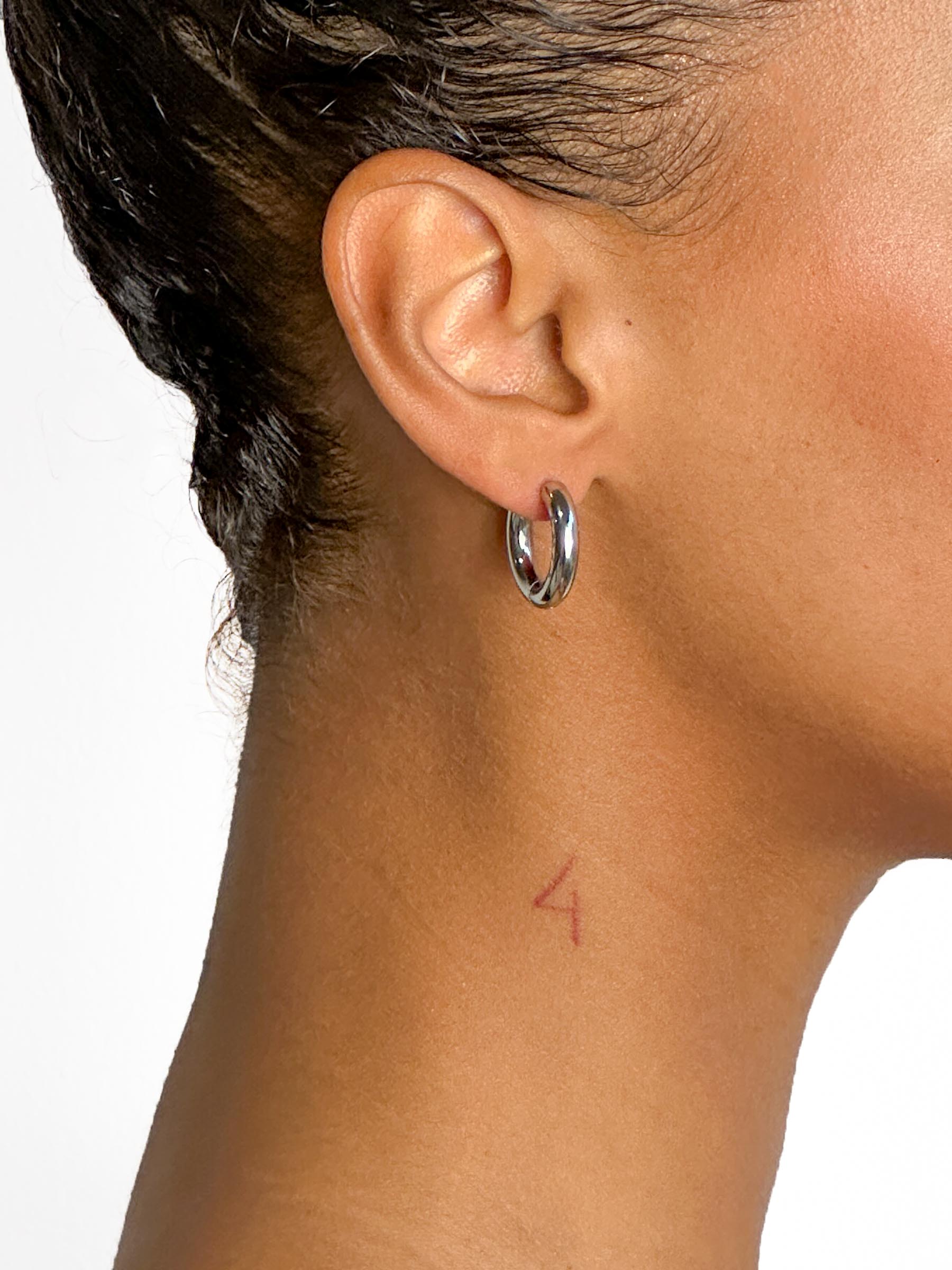 This pair of slim 4-millimeter silver stainless steel hoops have the Felt warped logo stamped on both sides. The outside of the hoop is highly polished and shining.