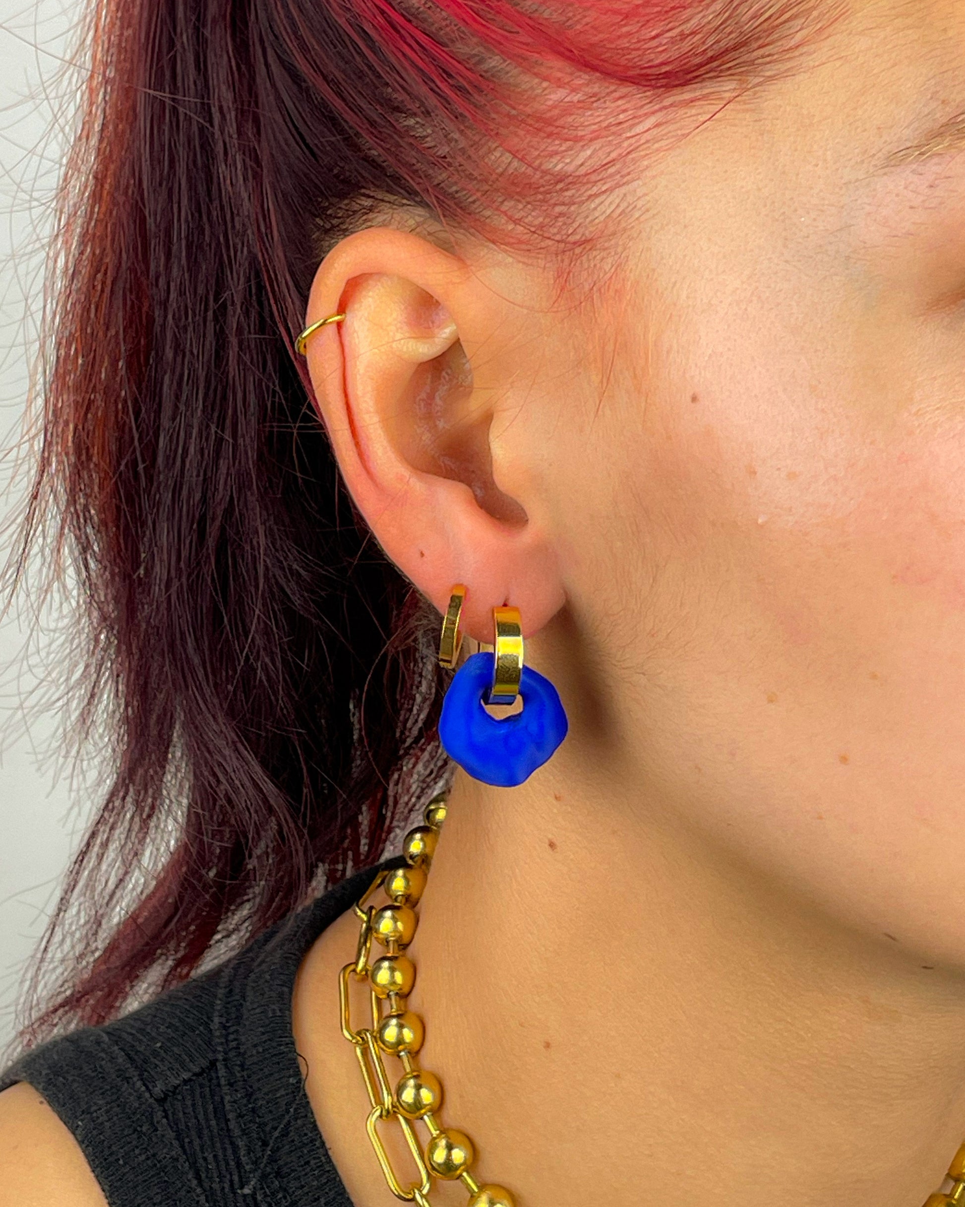 The Ivy blue Amoeba pendant hangs on bold Eon Chunky hoops, making a versatile accessory for any event. Wear it or keep it in your Felt pouch for easy style on the go.