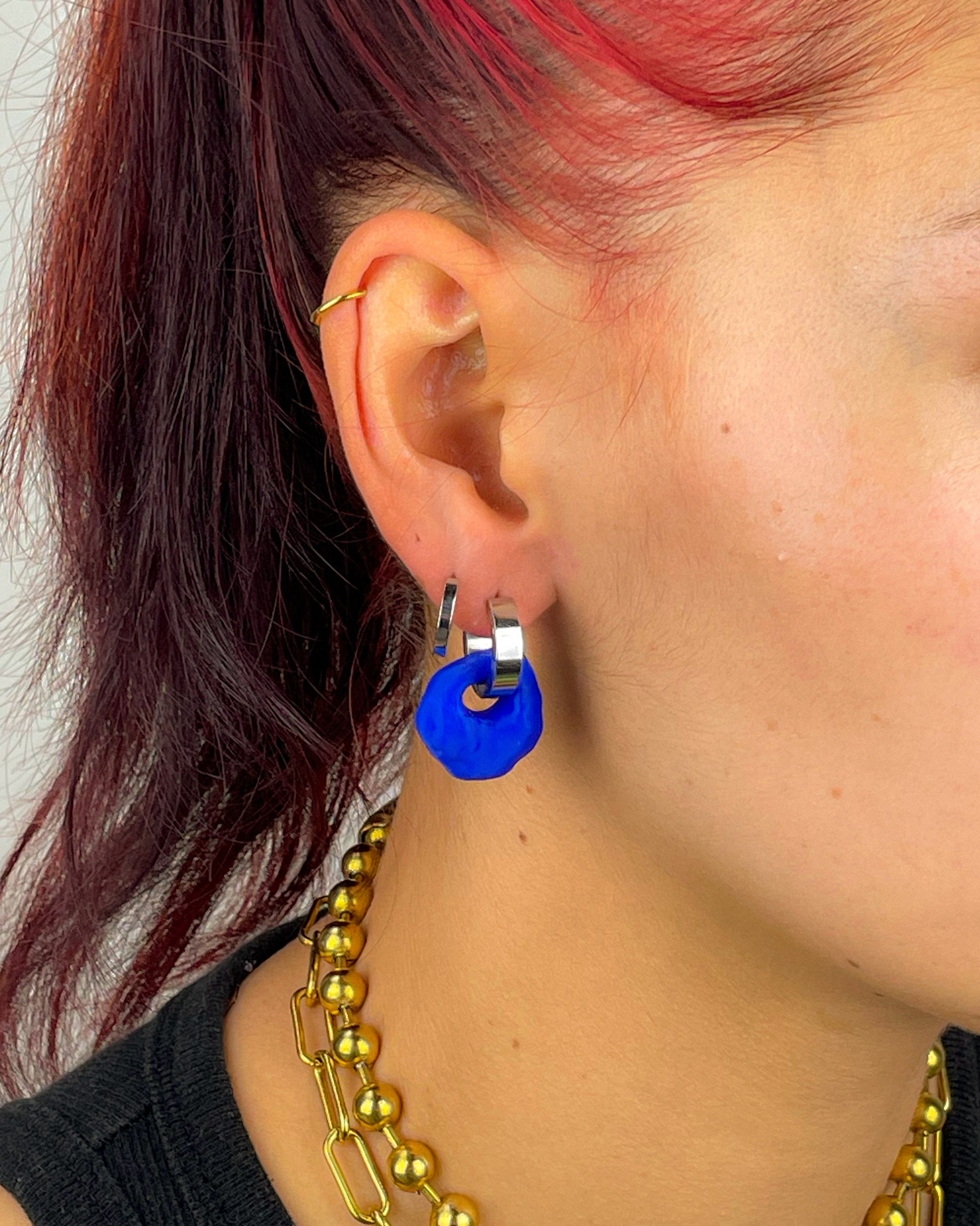 The Ivy blue Amoeba pendant elegantly dangles from the striking Eon Chunky hoops, offering a flexible accessory suitable for every event. Simply wear the Amoeba or store it in your Felt pouch, and you’re set for whatever occasion comes next.