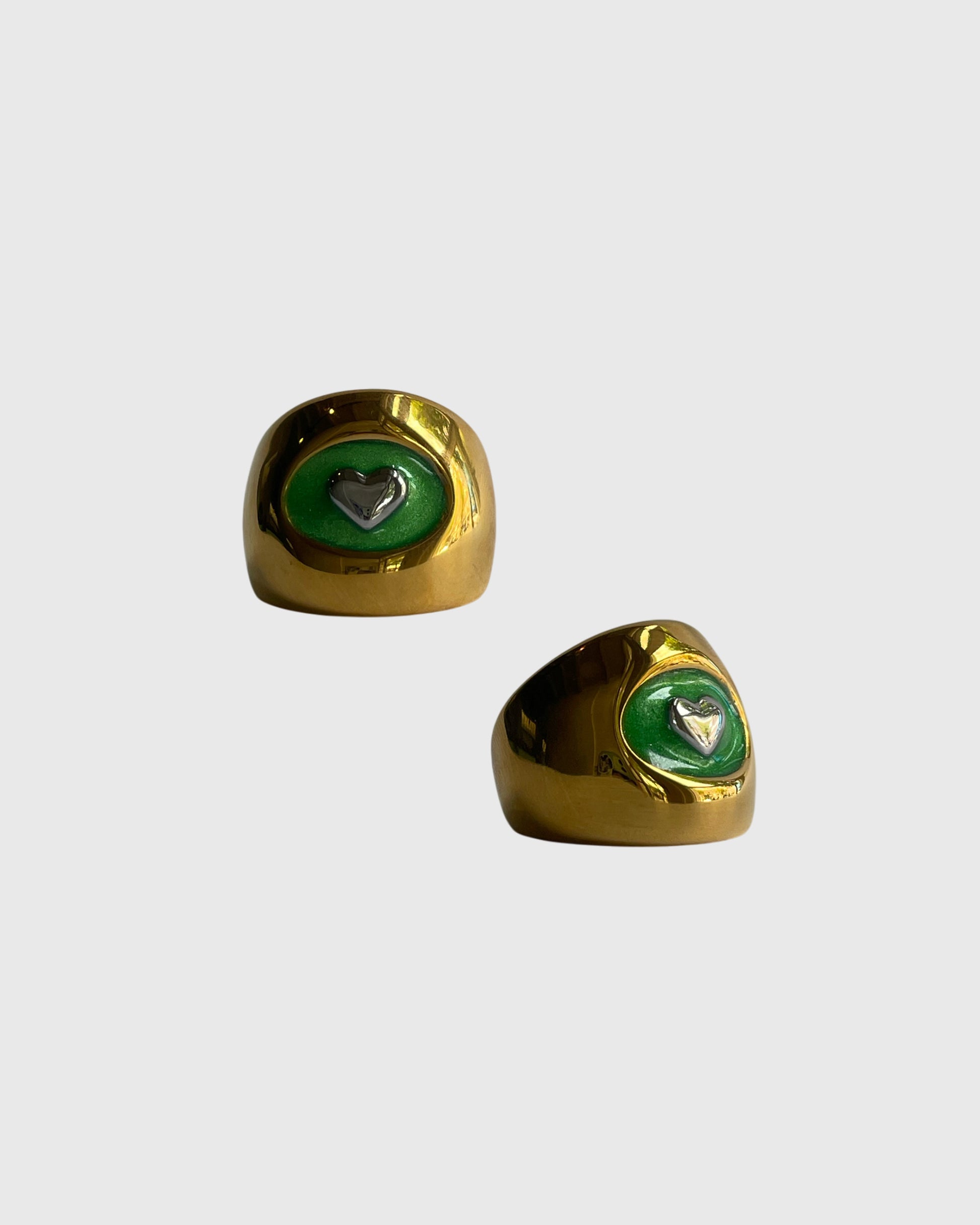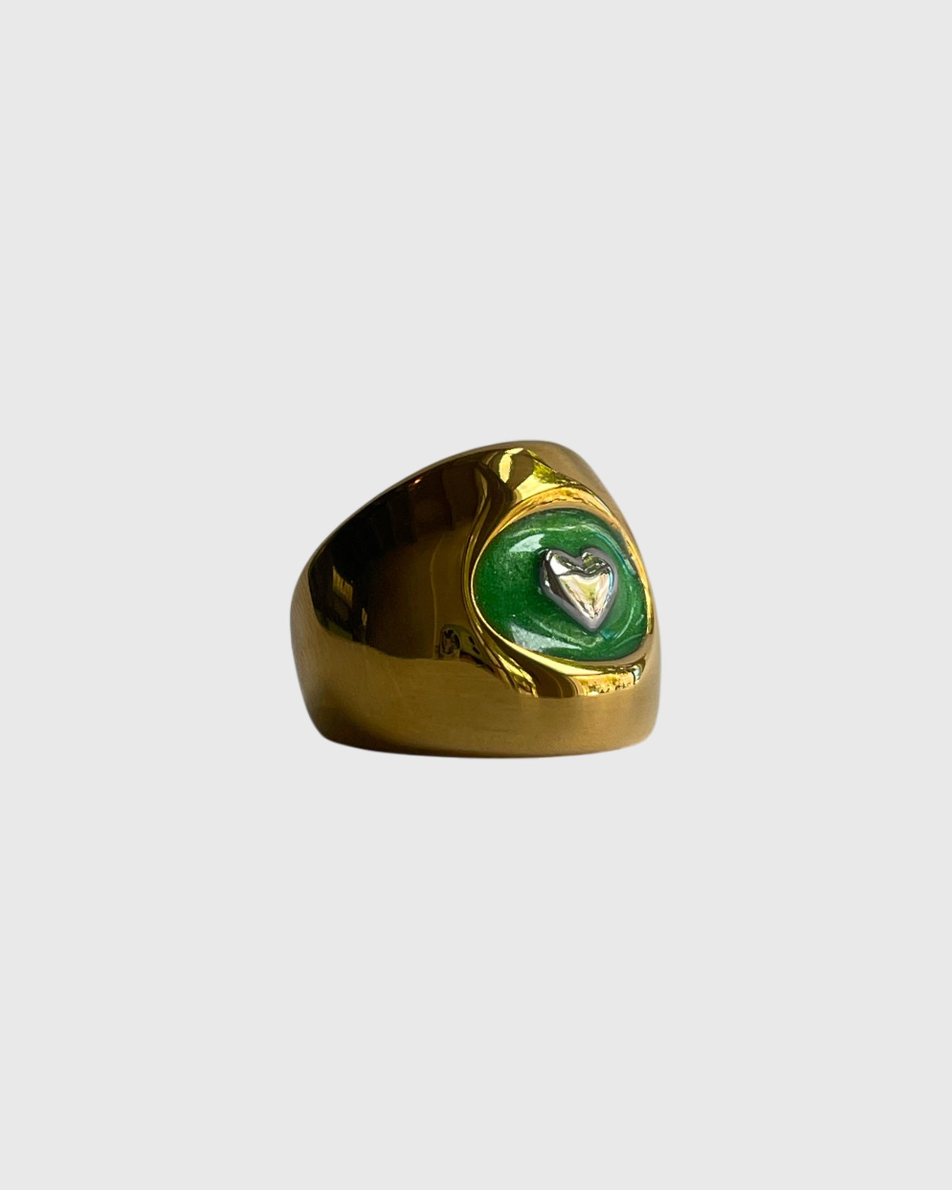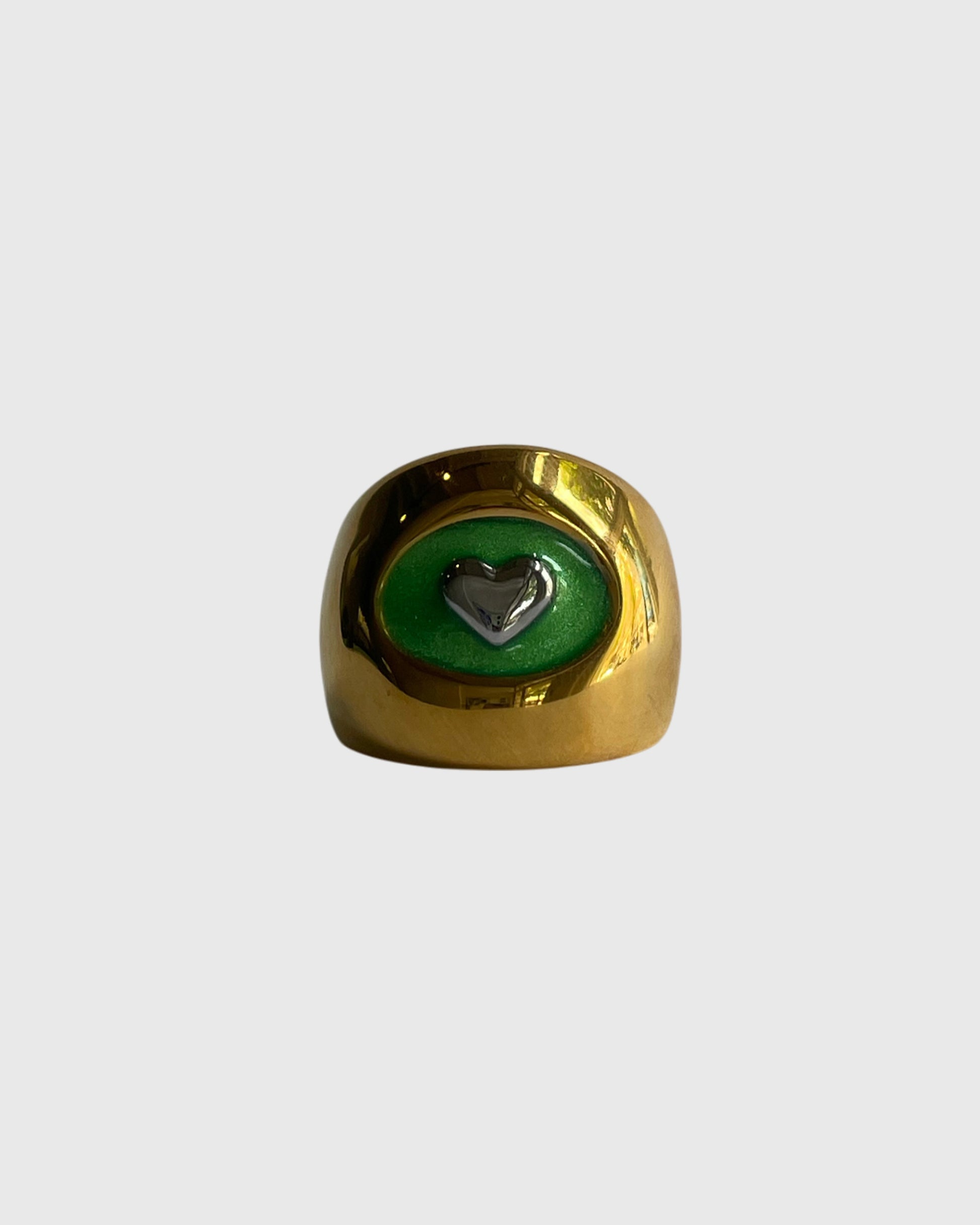 The Lobi ring dares to stand out with its bold, chunky design and vivid blue resin encircling a striking heart. Make a fearless statement by wearing your heart on your finger. Lobi means love in Surinamese.