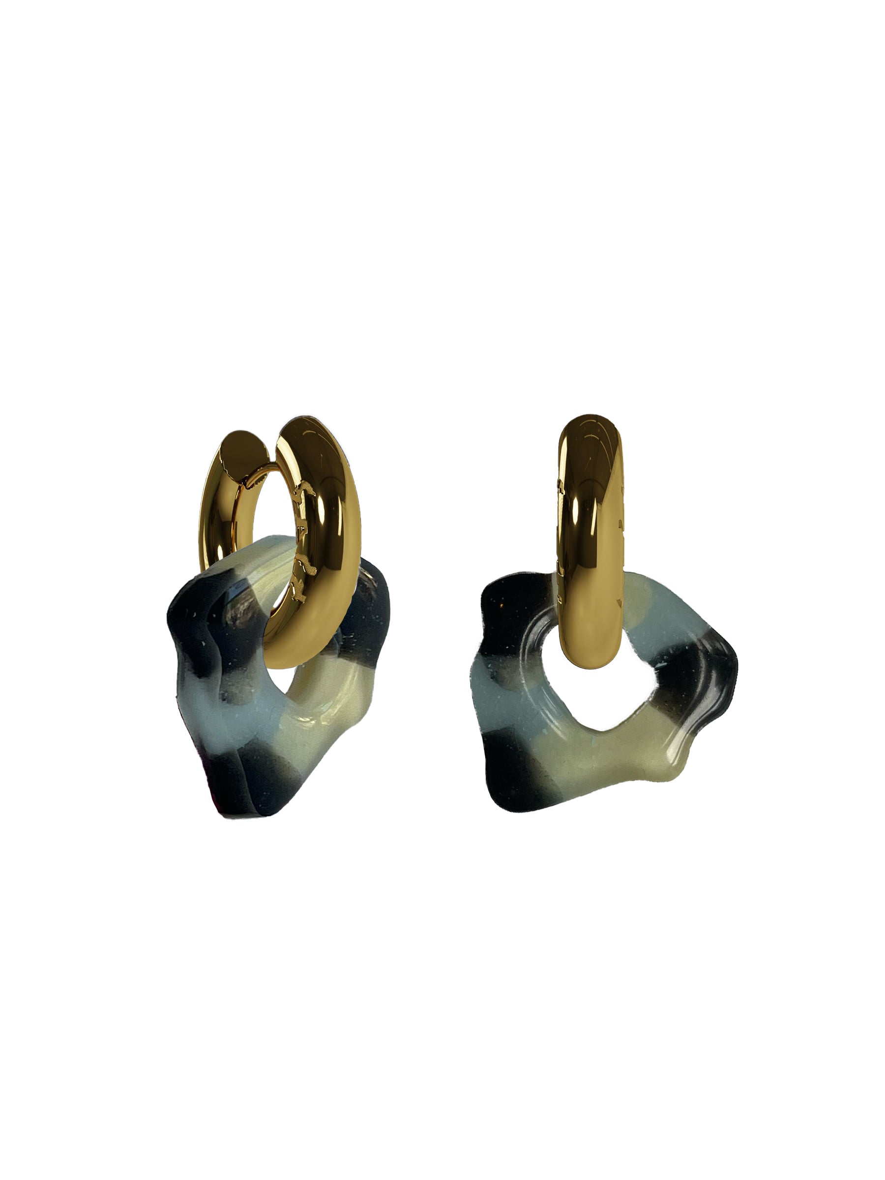 Amoeba-shaped resin earrings with stainless steel gold hoops. Handmade in Amsterdam. Hoops: 20 mm, Weight: 9 g.
