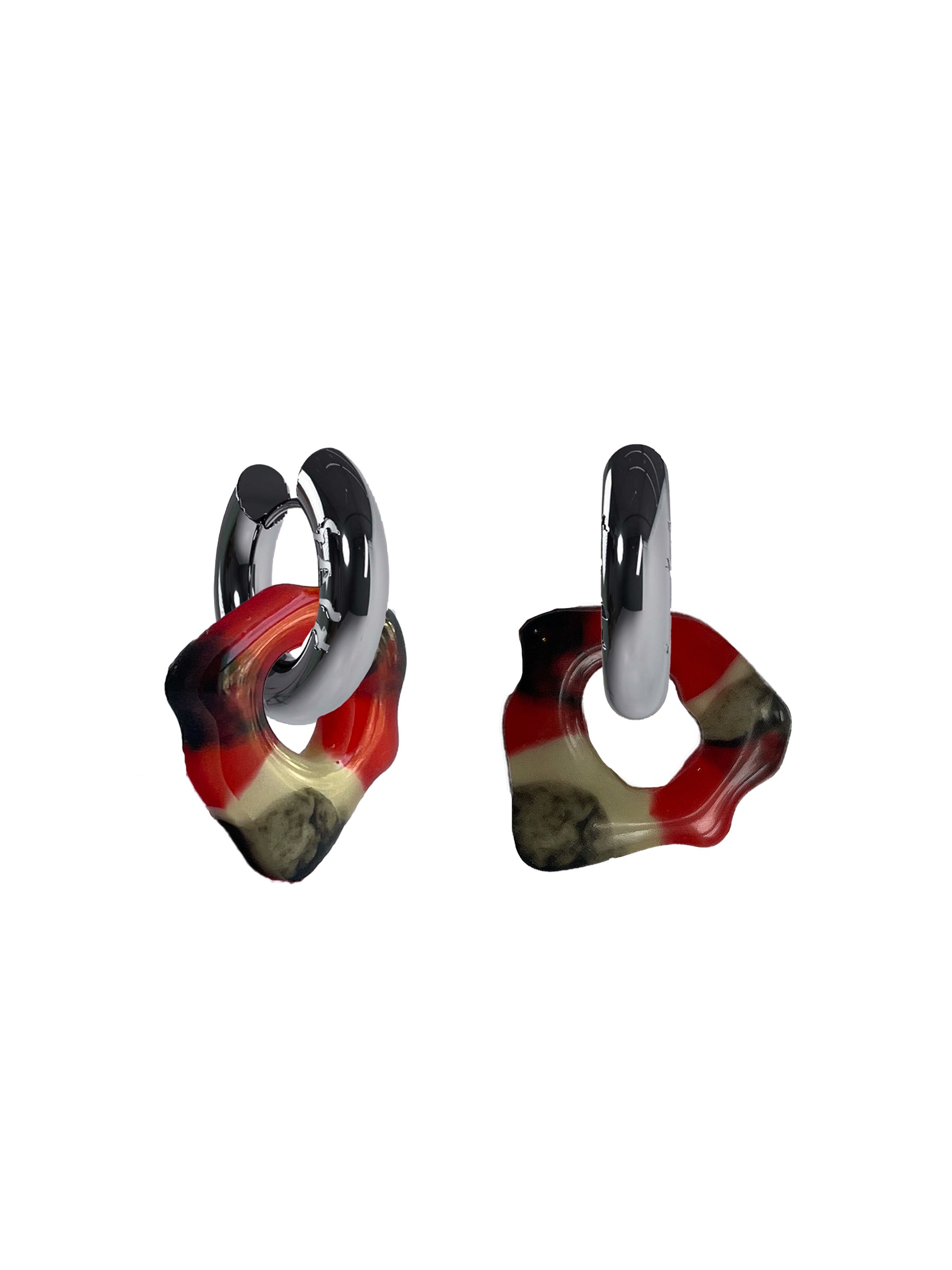 Amoeba-shaped resin earrings with stainless steel gold hoops. Handmade in Amsterdam. Hoops: 20 mm, Weight: 9 g.