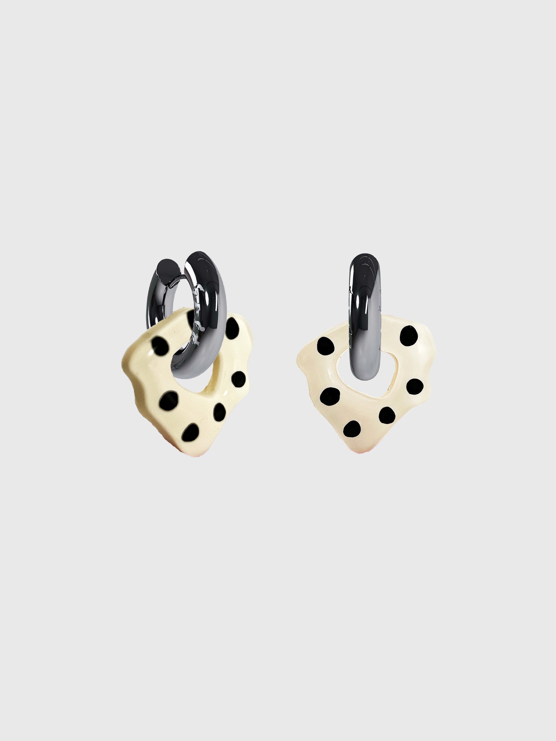 These silver hoops feature white Ora's with black polka dots that stand out beautifully against light colors, adding a cute and playful pop to any outfit.