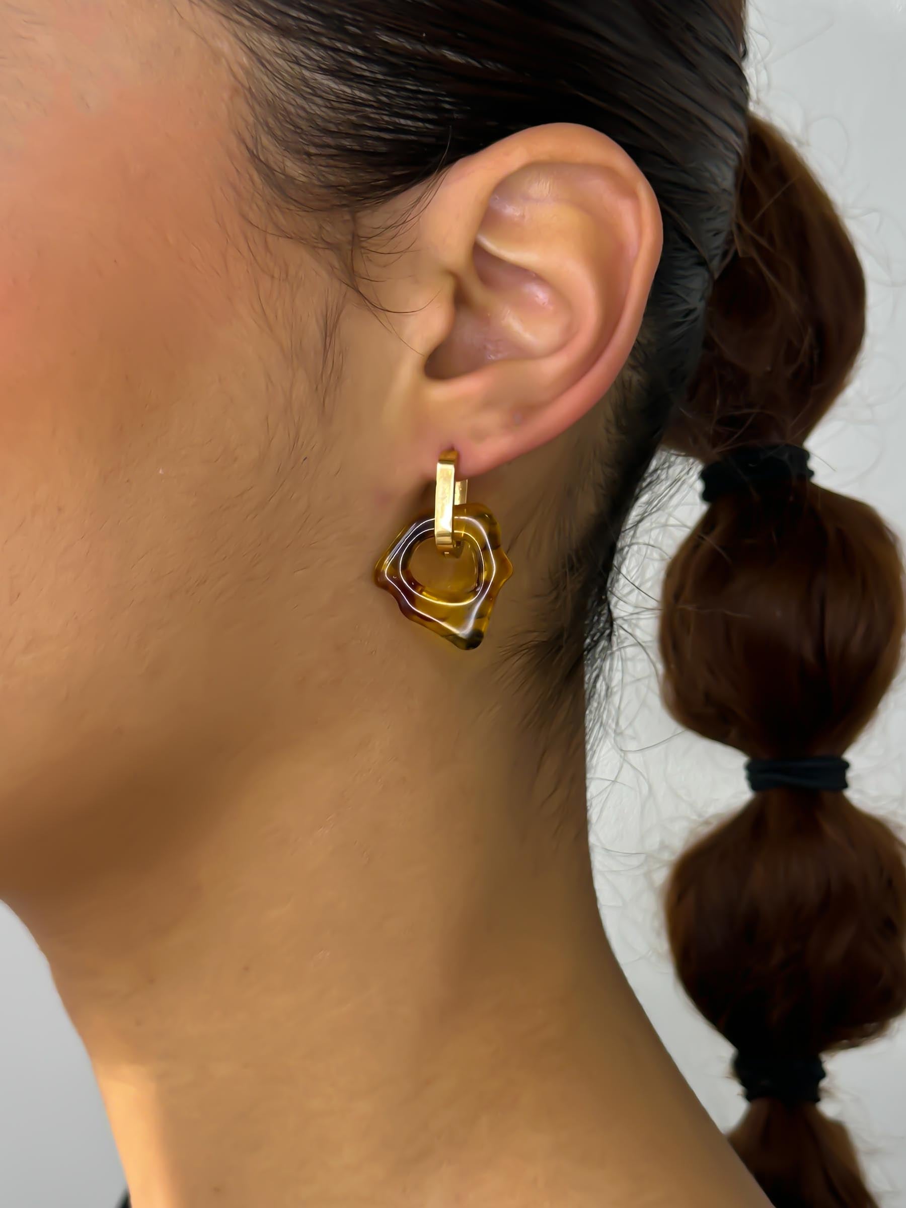 This transparent glass-like pair of Ora is lightweight and made to wear all day. It comes with the Cuno stainless steel hoops in gold. Please note: for this product you will receive the transparant pendant.