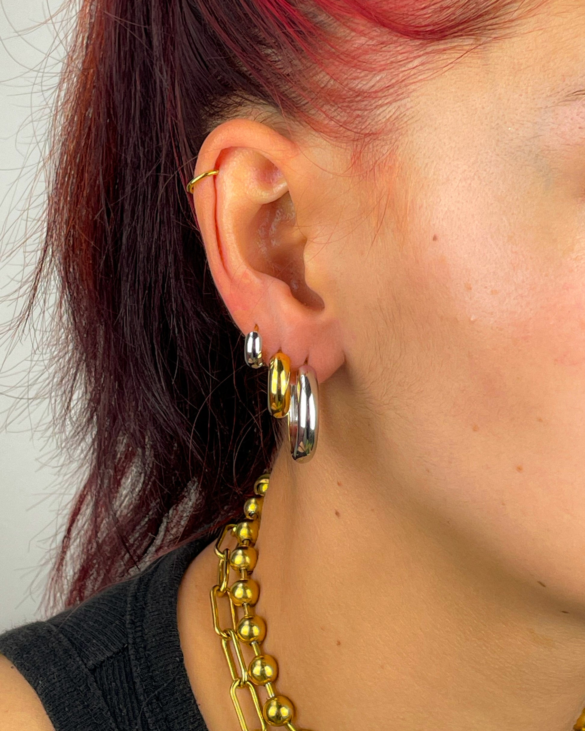 Discover the Rev earrings, a playful twist on style with their gold and silver combination. Wear them on either side and switch up your look effortlessly by simply turning them. Available in three sizes, these earrings let you mix and match to suit your mood and outfit with ease.