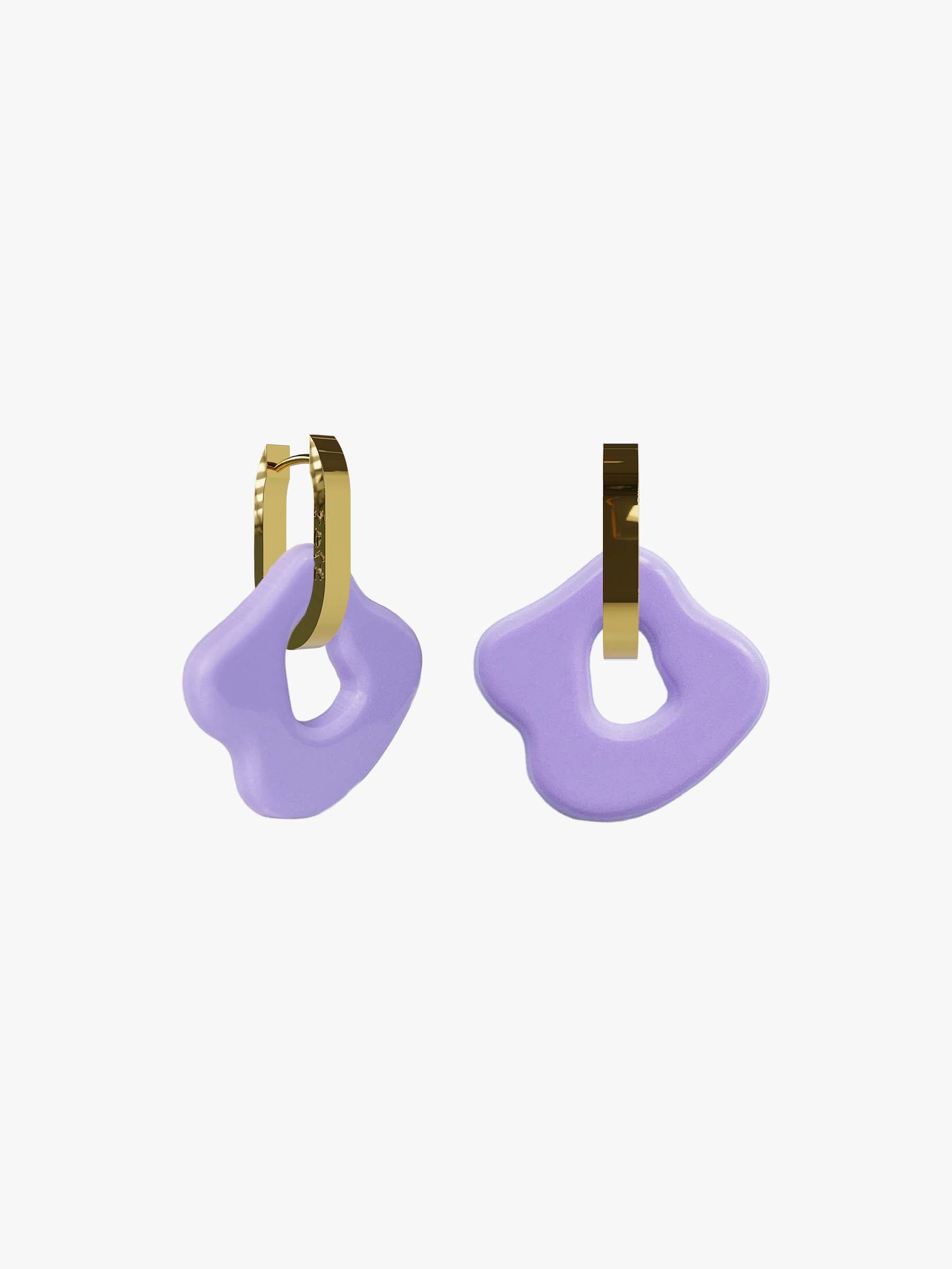 The baby of the earrings: Sol, a cute colorful Amoeba on a small stainless steel 15 mm hoop. So light, you’ll barely notice they’re there. Sol comes in multiple colors and on different hoops. Put them in and never take them out again.